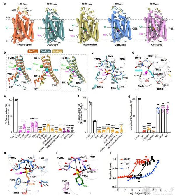 该研究揭示了TauT识别和转运牛磺酸及相关抑制剂的的分子机制。该工作解析了TauT蛋白处于五种不同功能状态下的高分辨率冷冻电镜结构,包括无底物向内开放状态(apo state)、底物牛磺酸结合的闭塞状态(occluded state)和内向转运中间状态(intermediate state),以及两种竞争性抑制剂胍基乙基磺酸盐(GES)和哌啶-4-磺酸盐(P4S)的闭塞状态。抑制剂GES和P4S采用竞争转运口袋的方式抑制牛磺酸转运。该研究揭示了TauT与同源蛋白GAT1等的一些共同特征和独特特征,以上特征将TauT与其他相关神经递质同向转运蛋白区分开来。研究人员还发现,抗癫痫药物tiagabine(GAT1抑制剂)能够有效抑制TauT介导的牛磺酸摄取。该发现为开发针对TauT功能的新型治疗策略提供了基础。