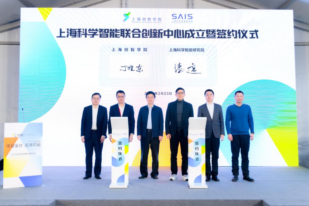 上海创智学院常务副院长丁晓东、上海科学智能研究院院长漆远代表签约,上海市经济和信息化委员会副主任张宏韬、上海市教育委员会副主任赵震、上海市科学技术委员会副主任屈炜、复旦大学校长助理、中国科学院院士彭慧胜共同见证中心成立