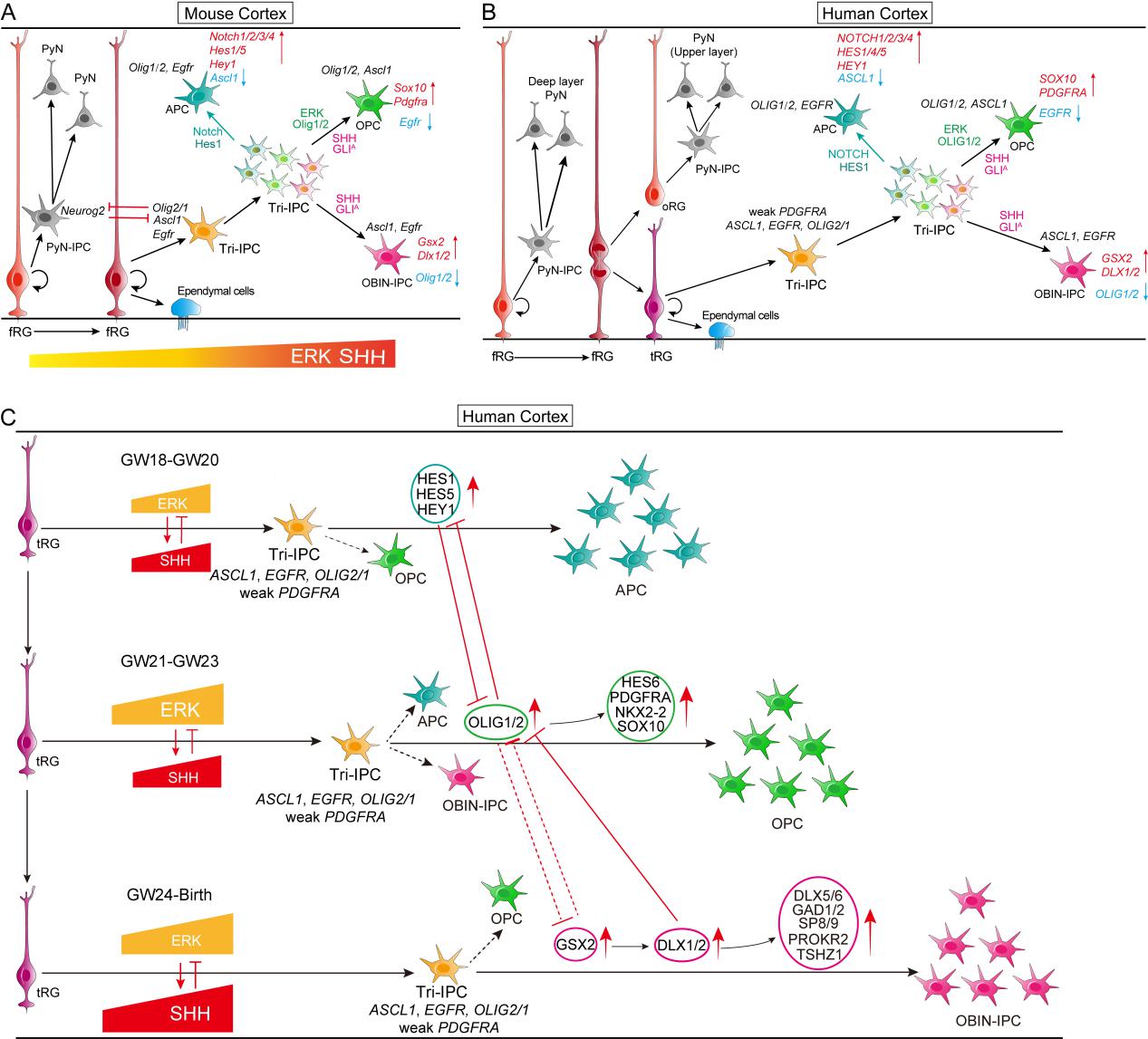 该系统地阐述了多种信号通路是如何协同调控神经胶质细胞的发育起始和随后的命运决定。研究发现,在小鼠皮质发育过程中,放射状胶质细胞(神经干细胞)经历从神经发生向胶质发生的范式转换:早期神经干细胞通过不对称分裂产生Neurog2+ 投射神经元前体细胞(PyN-IPCs),后期随着ERK和SHH信号通路的不断增强,从而触发了胶质发生的开关,由此神经干细胞便不再产生PyN-IPC和神经元,而是开始产生了一种具有可以生成三种不同类型细胞的“三潜能前体细胞”(TRI-IPC)。研究结果进一步显示,当TRI-IPC产生之后,NOTCH-HES信号通路首先决定了TRI-IPC分化为大脑皮质内的星形胶质细胞,随后ERK-SHH协同促进了少突胶质细胞的命运决定,最后SHH-SMO-GLI信号决定了TRI-IPC开始产生迁往嗅球的中间神经元。