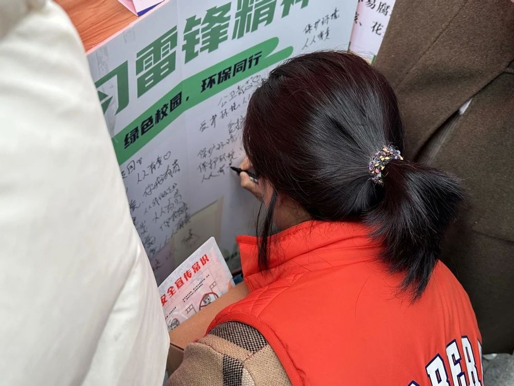 同学在环保承诺签名墙前写下环保承诺