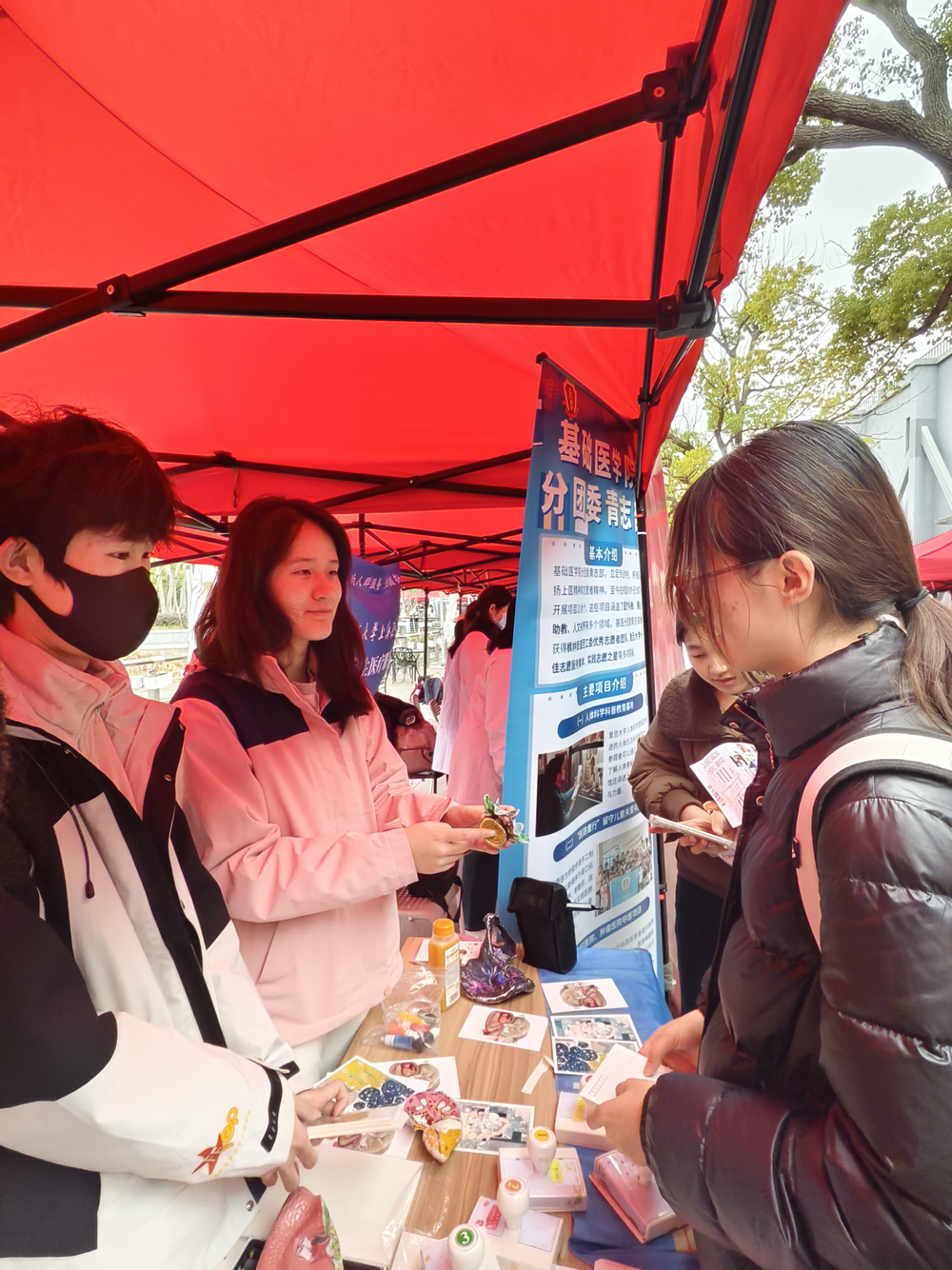 3月5日中午,江湾校区食堂广场上,华山医院研究生科普宣讲团(复旦大学上海医学院博医团科普分团)的公益市集热闹非凡。来自运动医学、皮肤科、消化科等多个科室的青年医生们,组成了专业的义诊咨询团队。活动期间,他们接待了众多前来咨询的同学,耐心倾听大家关于常见疾病的困扰,从专业角度给出详细的解答与建议,帮助同学们增强健康意识,掌握更多疾病预防和应对的知识。