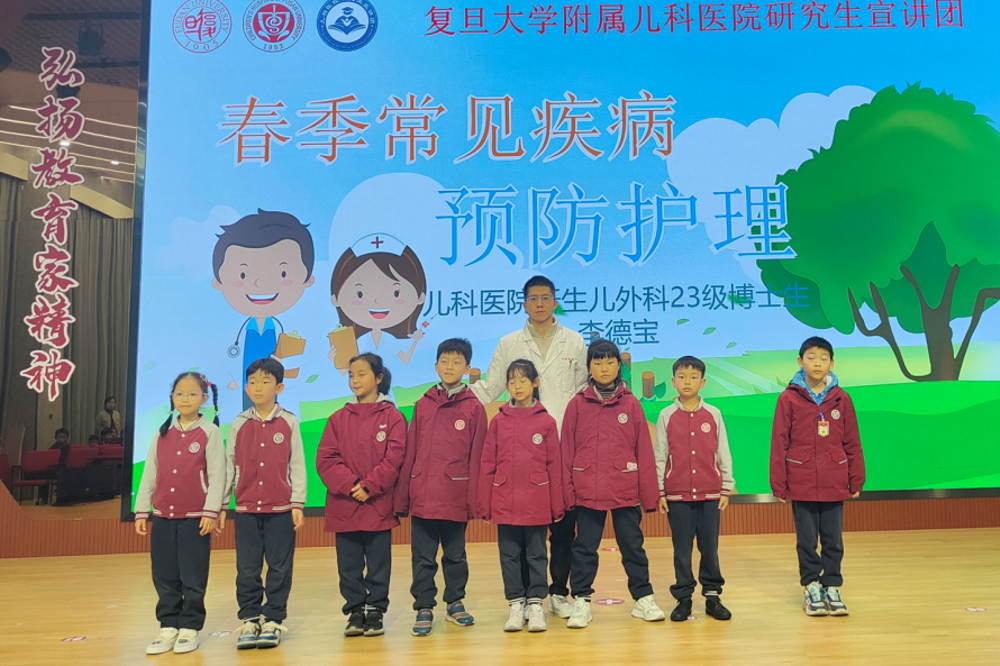 3月3日,儿科医院研究生宣讲团来到了华东师范大学附属闵行永德学校,开展了一场主题为“春季常见疾病的预防护理”的健康讲座,宣讲团成员通过绘声绘色的讲解,为小朋友们带来了一场生动有趣的疾病健康科普。