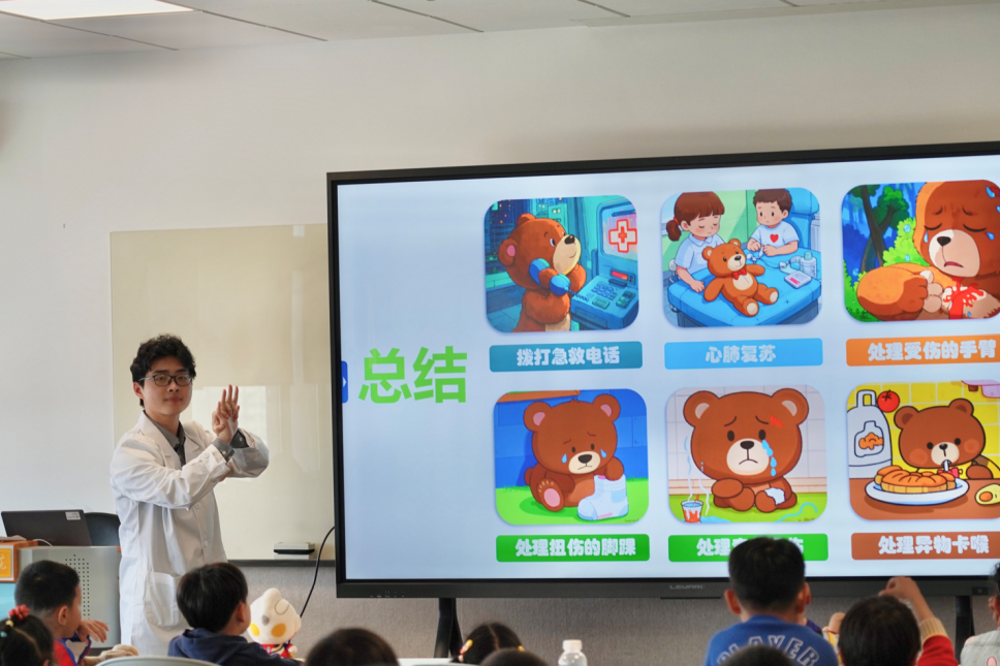 讲师以趣味问答形式开始这项活动,向家长和孩子们讲解日常急救要点,包括心肺复苏原则、烫伤处理等实用知识。