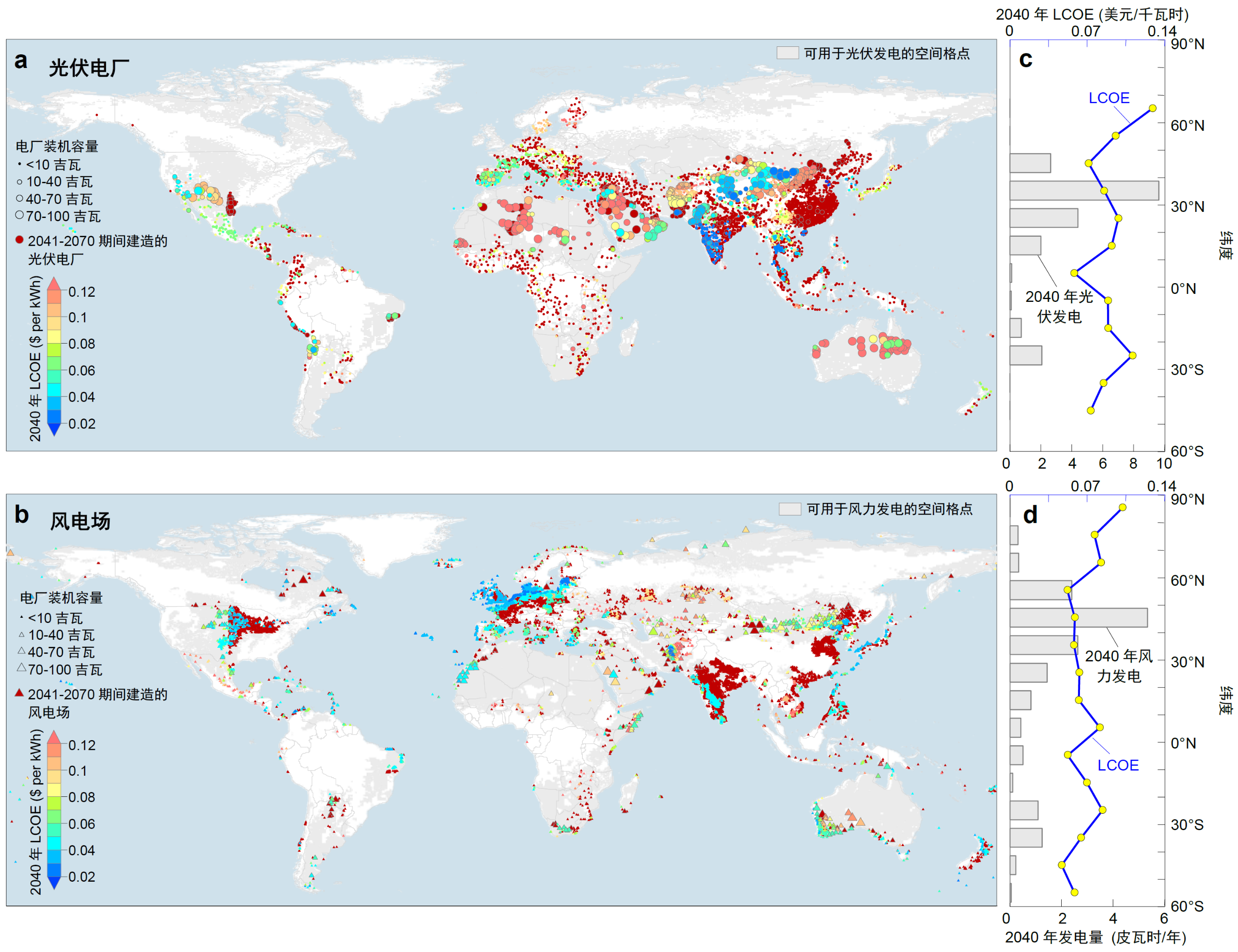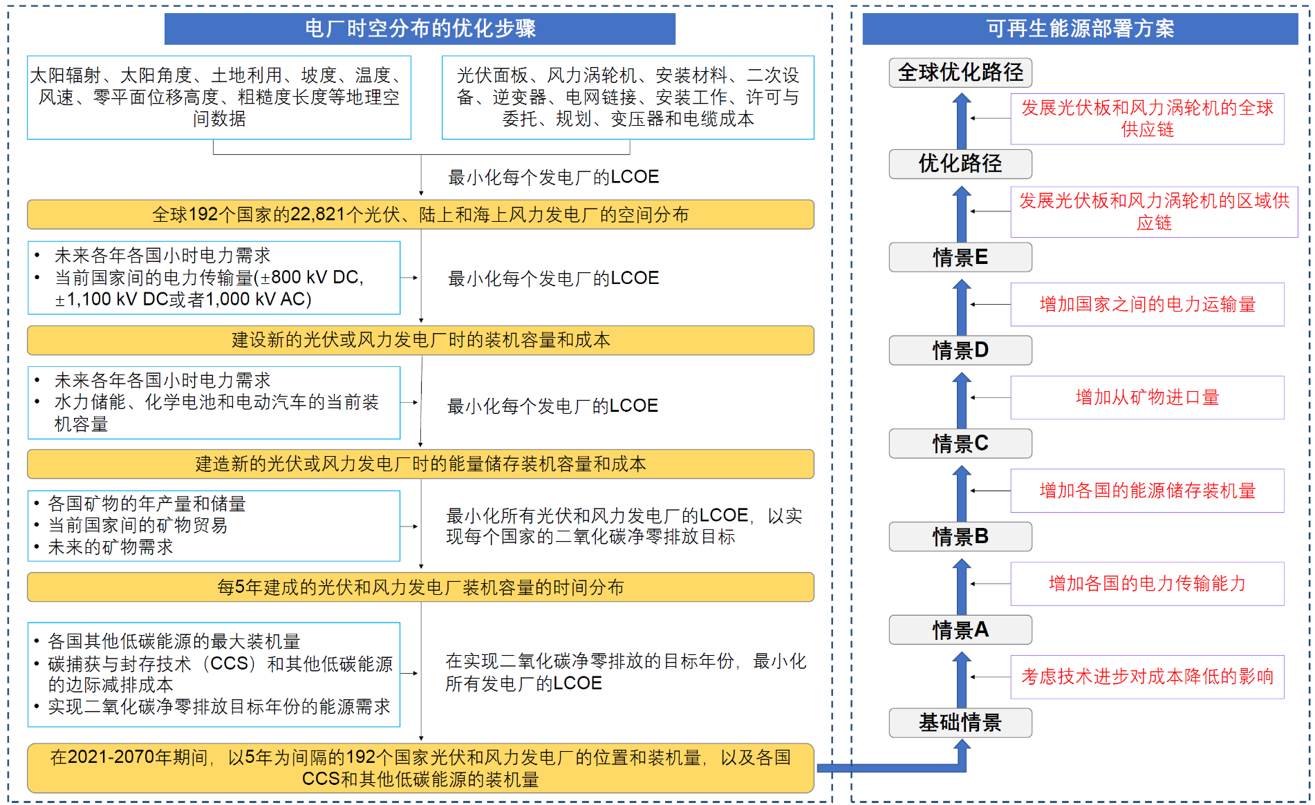 首先,研究开发了全球太阳能和风能的电力系统优化模型,综合考虑了全球多年太阳辐射和风向风速的小时级数据、气象和地貌等多种空间信息,构建了时空高分辨的地理信息数据智能系统,并考虑了技术改进、电网升级、统筹能源储存和电力传输等基础配套设施建设,以及区域电力传输、全球矿产贸易、优化光伏电池板和风力涡轮机全球供应链等方案对风光发电潜力的作用(图1)。