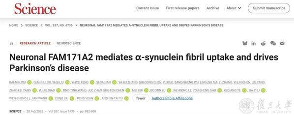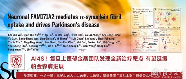 2025年2月20日,复旦大学附属华山医院郁金泰教授团队与复旦大学脑科学转化研究院袁鹏团队和中科院上海有机化学研究所生物与化学交叉研究中心刘聪教授团队合作,通过5年的临床和基础研究获得重大科研突破,在全球首次发现了帕金森病全新治疗靶点FAM171A2,并找到了具有潜在治疗作用的小分子化合物。此次研究发现的全新治疗靶点和开发药物有望从疾病早期对帕金森病进行干预,延缓疾病进展。结合现有的对症治疗手段,将会实现帕金森病病因治疗与症状缓解的双重突破,造福数百万患者。相关研究成果于今天在线发表于《科学》(Science)。