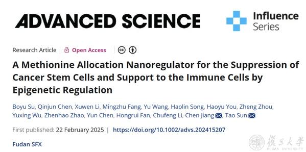 2025年2月22日,复旦大学药学院孙涛、蒋晨团队设计构建了一种干预肿瘤蛋氨酸摄取并联合免疫原性化疗的共递送纳米调节器(AS-F-NP)。相关成果以“A Methionine Allocation Nanoregulator for the Suppression of Cancer Stem Cells and Support to the Immune Cells by Epigenetic Regulation”为题,在线发表于期刊《先进科学》(Advanced Science)。