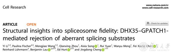 2025年2月28日,复旦大学生物医学研究院程净东课题组与合作者在《细胞研究》(Cell Research)在线发表了题为“Structural insights into spliceosome fidelity: DHX35–GPATCH1 mediated rejection of aberrant splicing substrates”的研究论文,鉴定并揭示了剪接过程中DHX35–GPATCH1参与识别及丢弃异常剪接底物的质量控制的机制。