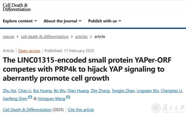 2025年2月17日,复旦大学附属妇产科医院王红艳教授课题组联合上海交通大学医学院附属第九人民医院沈键锋教授,在期刊《细胞死亡和分化》(Cell Death & Differentiation)上发表了题为“The LINC01315-encoded small protein YAPer-ORF competes with PRP4k to hijack YAP signaling to aberrantly promote cell growth”的研究成果,揭示了长链非编码RNA编码短肽调控YAP活性导致细胞增殖异常相关疾病的新机制。