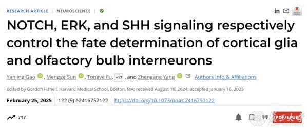 2025年2月25日,复旦大学脑科学研究院杨振纲所带领的研究团队,以《NOTCH、ERK和SHH信号通路控制大脑皮质胶质细胞和嗅球中间神经元的命运决定》(“NOTCH, ERK, and SHH signaling respectively control the fate determination of cortical glia and olfactory bulb interneurons”)为题在《美国国家科学院院刊》(PNAS)发表科研论文,比较系统的回答了上述问题,为全面理解大脑内各种细胞发育的基本规律增添了新的知识。这对脑胶质瘤的不同亚型的诊疗,也可能提供了一个新的视角。