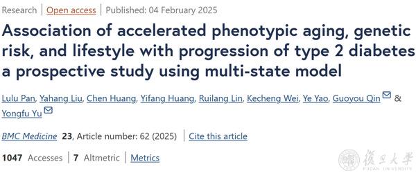 2025年2月4日,复旦大学公共卫生学院余勇夫、秦国友课题组依托大型前瞻性队列,针对表型衰老加速,并结合多基因风险评分(PRS)以及生活方式评分,系统性地探究了表型衰老加速、遗传风险以及生活方式对2型糖尿病进展的影响。研究成果“Association of accelerated phenotypic aging, genetic risk, and lifestyle with progression of type 2 diabetes: a prospective study using multi-state model”在BMC Medicine上发表。
