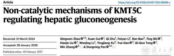 2025年2月10日,复旦大学基础医学院代谢分子医学教育部重点实验室潘东宁团队在《自然-通讯》(Nature Communications)期刊发表了题为“Non-catalytic mechanisms of KMT5C regulating hepatic gluconeogenesis”的研究论文。该研究揭示组蛋白甲基转移酶KMT5C通过非催化机制调控肝糖异生的全新作用模式。