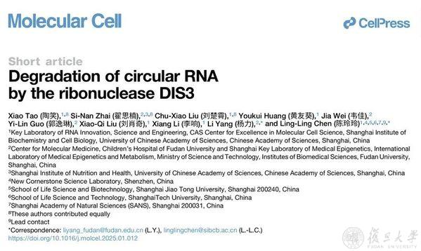 2025年2月17日,复旦大学生物医学研究院杨力研究员团队与中国科学院分子细胞科学卓越创新中心(生物化学与细胞生物学研究所)陈玲玲研究组在《分子细胞》(Molecular Cell)期刊上发表了文章“Degradation of circular RNA by the ribonuclease DIS3”。该研究解析了生理条件下环形RNA被核酸内切酶DIS3监控降解的新机制,实现了对环形RNA“生老病死”过程中特异调控及分子特征等基础研究的闭环。