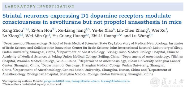 2025年2月5日,复旦大学基础医学院、脑科学研究院黄志力、王露团队与北京协和医院教授黄宇光合作,在《英国麻醉杂志》(British Journal of Anaesthesia)上发表了题为“Striatal neurones expressing D1 dopamine receptors modulate consciousness in sevoflurane but not propofol anaesthesia in mice”的研究成果,揭示了背侧纹状体中D1型多巴胺受体神经元在七氟烷和丙泊酚麻醉中的差异性调节作用。