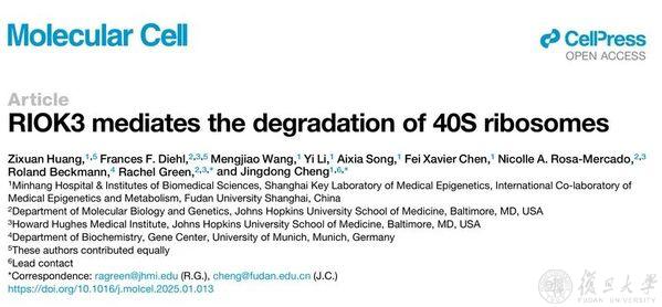 2024年2月12日,复旦大学生物医学研究院程净东课题组与美国约翰霍普金斯大学Rachel Green教授课题组合作以长文形式在《分子细胞》(Molecular Cell)上发表了文章 “RIOK3 mediates the degradation of 40S ribosomes”。该研究首次鉴定了RIOK3蛋白作为40S核糖体泛素化的“reader”,识别并介导了40S核糖体的降解。此发现填补了核糖体质量控制领域中泛素化与核糖体降解之间关键机制的空白,为阐明细胞如何维持核糖体稳态提供了全新见解。
