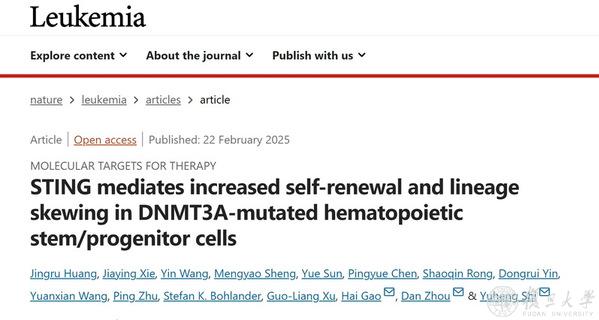 2025年2月22日,复旦大学生物医学研究院青年副研究员石玉衡与合作者在《白血病》(Leukemia)杂志上发表了文章题为 “STING mediates increased self-renewal and lineage skewing in DNMT3A-mutated hematopoietic stem/progenitor cells” 的研究论文。该研究首次报道了 cGAS-STING 通路在 Dnmt3a 缺失造血干细胞/祖细胞(Hematopoietic stem/progenitor cells, HSPCs)中的激活机制以及其对HSPC自我更新和下游细胞偏系分化的影响,并证明抑制该信号通路可以有效的缓解 Dnmt3a 缺失诱发CH的进展,并延缓了携带DNMT3A突变血液恶性肿瘤的发展速度。