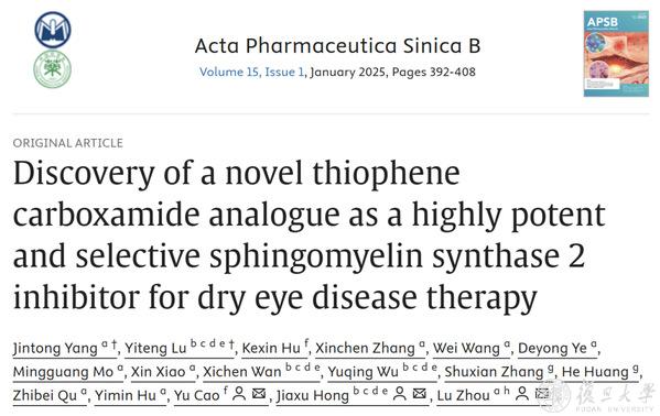 2025年2月12日,复旦大学药学院周璐教授团队在《药学学报》(Acta Pharmaceutica Sinica B)杂志上发表题为“Discovery of a novel thiophene carboxamide analogue as a highly potent and selective sphingomyelin synthase 2 inhibitor for dry eye disease therapy”的研究论文,开发了一系列新型噻吩甲酰胺类选择性高效SMS2抑制剂并首次将其应用于干眼症的治疗研究。