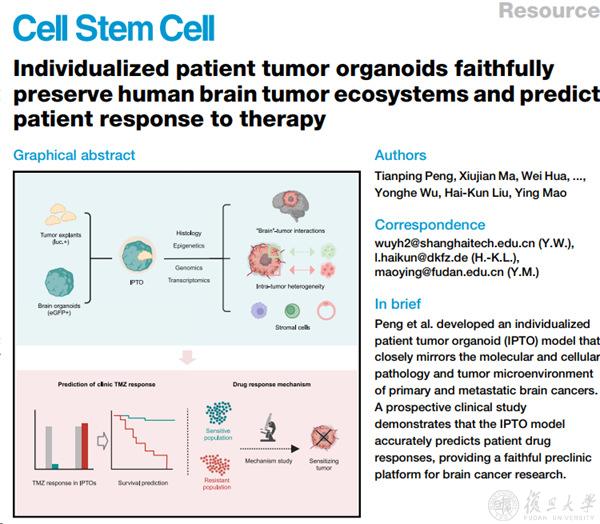 2025年2月11日,复旦大学附属华山医院毛颖团队与上海科技大学免疫化学研究所刘海坤/吴永和教授团队联合,历时4年多,自主研发了一款新型的个体化脑肿瘤类器官(IPTO)模型,建立了脑肿瘤类器官库,并在精准预测患者药物反应方面展现了优越性。相关研究成果《个体化脑肿瘤类器官模拟肿瘤微环境并预测患者治疗反应》(“Individualized Patient Tumor Organoids Fully Recapitulate Human Brain Tumor Ecosystems and Predict Patient Response to Therapy”)于《细胞-干细胞》(Cell Stem Cell)发表,为进一步研究脑肿瘤发生发展机制、筛选药物、制定个体化精准治疗方案提供了重要方法。