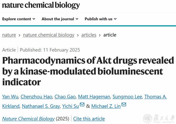 2025年2月11日,复旦大学脑科学转化研究院苏一驰青年研究员与美国斯坦福大学Michael Z. Lin教授合作,在生物学期刊《自然化学生物学》(Nature Chemical Biology)发表题为Pharmacodynamics of Akt drugs revealed by a kinase-modulated bioluminescent indicator的研究论文。该研究开发了一种非侵入性生物发光成像技术,实现活体动物中Akt靶向药物效应的动态可视化。研究团队基于ATP非依赖性萤光素酶NanoLuc,设计出基因编码的Akt激酶调控生物发光指示蛋白(KiMBI),其发光信号强度与Akt活性呈负相关。通过在活体小鼠肿瘤、大脑等靶组织内表达Akt KiMBI,并在给药后的多个时间点进行生物发光成像,成功构建了Akt药物作用的完整PD时间曲线。