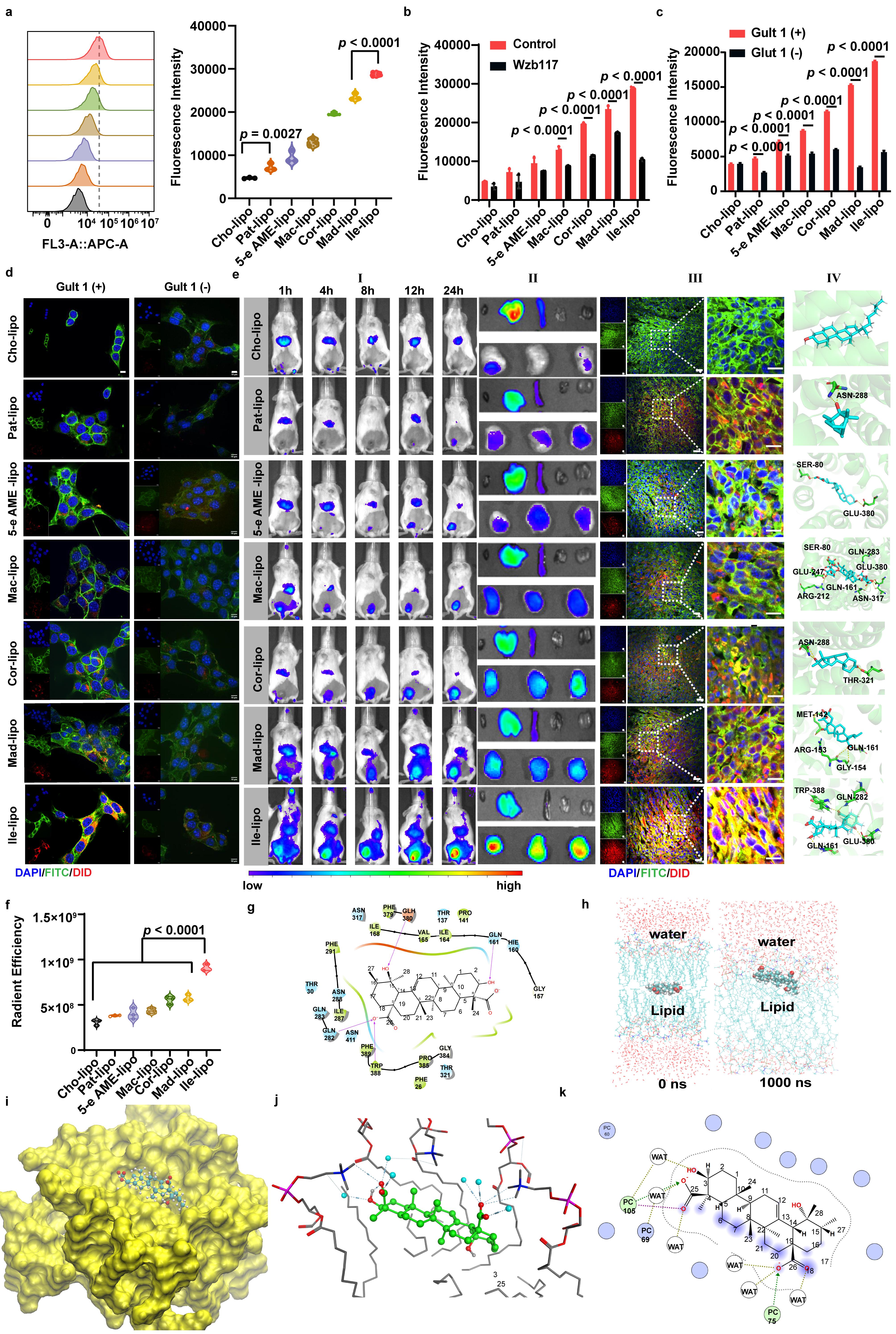 上述具LMR功能的候选物均表现出显著的Glut1介导的肿瘤靶向能力,其制备而成的脂质体肿瘤靶向作用均优于传统胆固醇脂质体。此外,Ile脂质体(Ile-lipo)的肿瘤靶向作用最优(图3)。