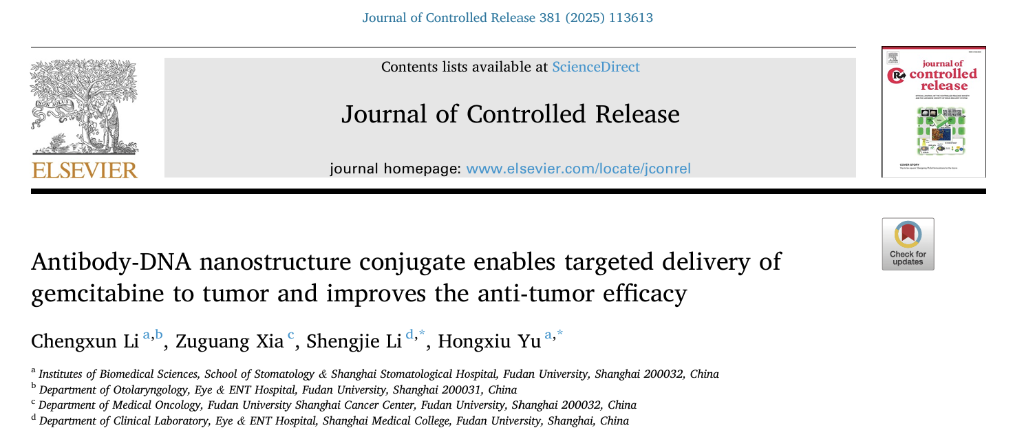 2025年3月9日,复旦大学生物医学研究院、附属口腔医院余红秀教授和附属眼耳鼻喉科医院李圣杰团队在Journal of Controlled Release上发表了题为"Antibody-DNA nanostructure conjugate enables targeted delivery of gemcitabine to tumor and improves the anti-tumor efficacy"的研究论文。该研究将DNA纳米技术与抗体靶向相结合,设计出高载药量的抗体-DNA纳米结构偶联物(ADNC),显著提升吉西他滨的靶向性和抗肿瘤效果,同时规避其骨髓毒性,为实体瘤治疗提供了新策略。