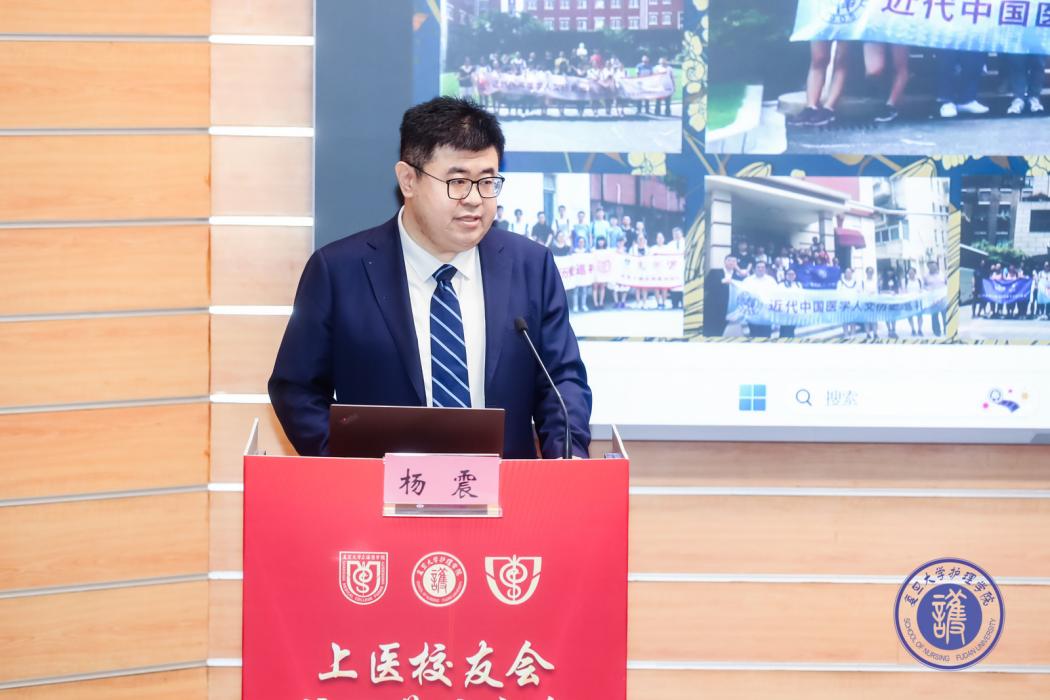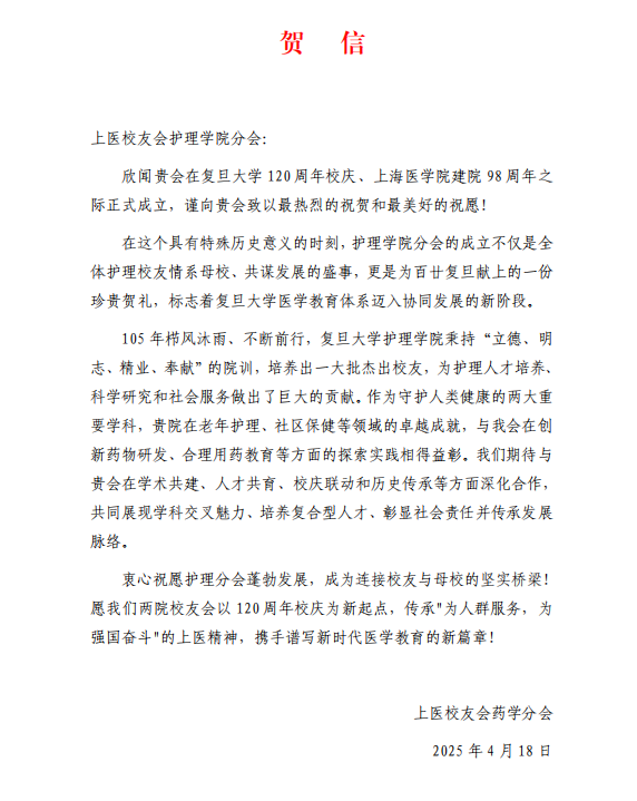 上医校友会药学分会会长、原上海医科大学党委副书记熊仿杰代表上医校友会药学分会致贺护理学院分会成立并宣读贺信。熊仿杰表示,护理分会的成立,不仅是校友情系母校的体现,更标志着医学教育协同发展迈入新阶段。未来,双方将进一步加强学术共建、人才培养等合作,共同传承"为人群服务,为强国奋斗"的上医精神,携手推动医学教育高质量发展。