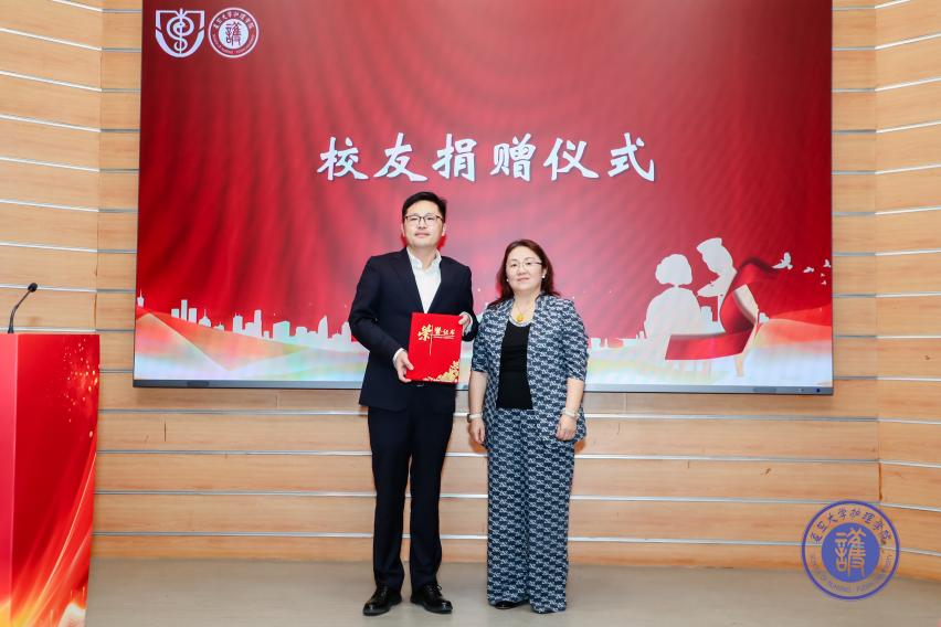 在校友捐赠仪式环节,包江波为护理学院2006级校友金硕贇颁发捐赠证书。金硕贇动情地表达对母校的感谢,并表示将在养老事业中继续秉承母校的“团结、服务、牺牲”的精神砥砺前行,为校友会的工作做出自己的贡献。