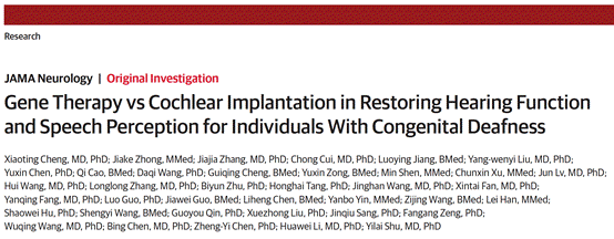 近日,复旦大学附属眼耳鼻喉科医院耳聋基因治疗团队发现耳畸蛋白缺陷(OTOF)基因治疗恢复患者自然听力,在噪声言语与音乐感知中比人工耳蜗表现更优。此研究是全球首个基因治疗与人工耳蜗的队列研究,发表于国际权威期刊《美国医学会·神经病学》(JAMA Neurology),论文题为《基因治疗与人工耳蜗植入在恢复先天性耳聋患者听觉功能和言语感知方面的比较》(“Gene Therapy vs Cochlear Implantation in Restoring Hearing Function and Speech Perception for Individuals with Congenital Deafness”)。该研究首次系统地比较了先天性耳聋儿童接受基因治疗与人工耳蜗植入后的多维度效果差异,由复旦大学附属眼耳鼻喉科医院、国家卫健委听觉医学重点实验室、上海市罕见病基因编辑与细胞治疗重点实验室(筹)的舒易来教授、李华伟教授、陈兵教授、王武庆教授团队领衔,联合哈佛大学医学院陈正一教授完成。
