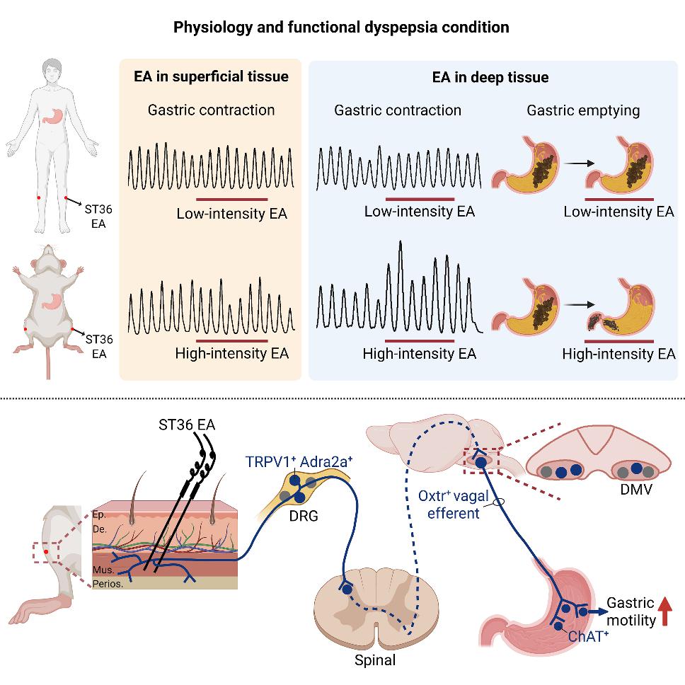 该研究揭示了电针对胃功能调控具有显著的组织层次特异性和强度依赖性特征,并阐明其作用的“躯体感觉-迷走神经-胃反射”神经解剖学机制,为优化临床电针治疗胃动力障碍的方案提供了科学依据。该研究结果不仅深化了对躯体体表部位(穴位)刺激机制的理解,同时更为制定精准化电针治疗方案奠定了理论基础。