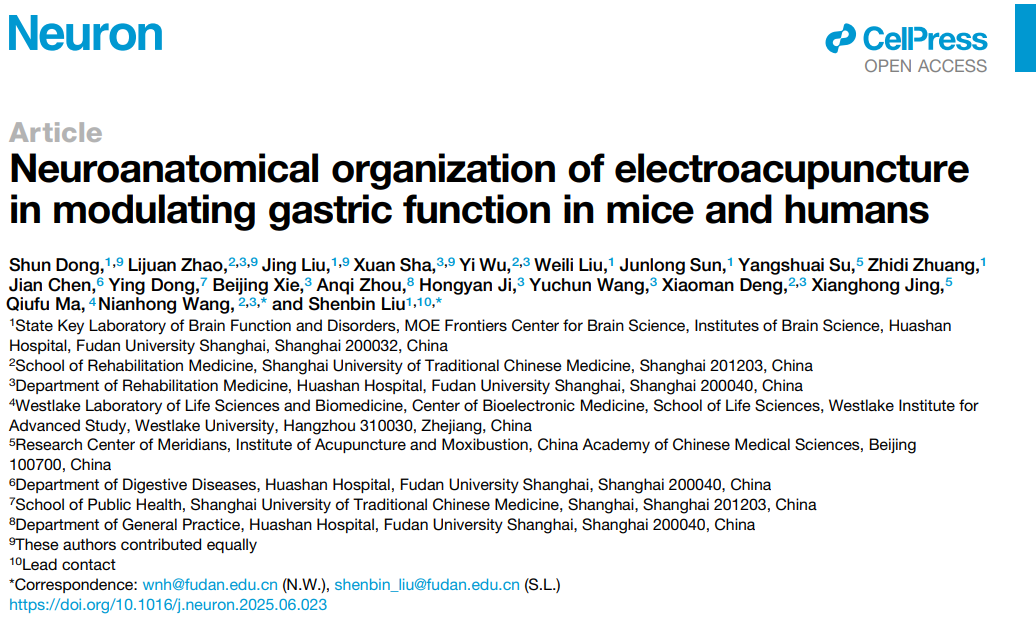 2025年7月25日,复旦大学脑科学研究院柳申滨团队及华山医院王念宏团队在《神经元》(Neuron)上发表题为《小鼠和人类中电针调节胃功能的神经解剖学机制》(“Neuroanatomical organization of electroacupuncture in modulating gastric function in mice and humans”)的研究论文,系统阐明了高强度深部组织电针刺激调控胃功能的效应规律及其神经解剖学基础,并成功将这一研究成果转化为功能性消化不良的临床治疗方案。