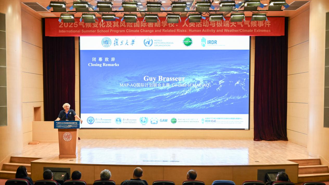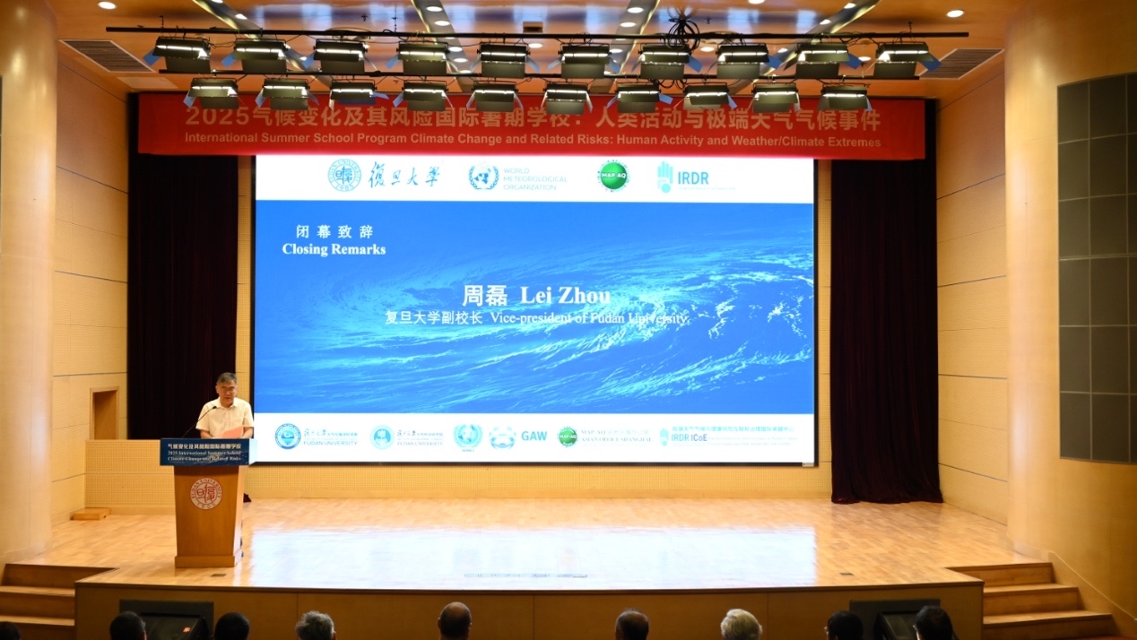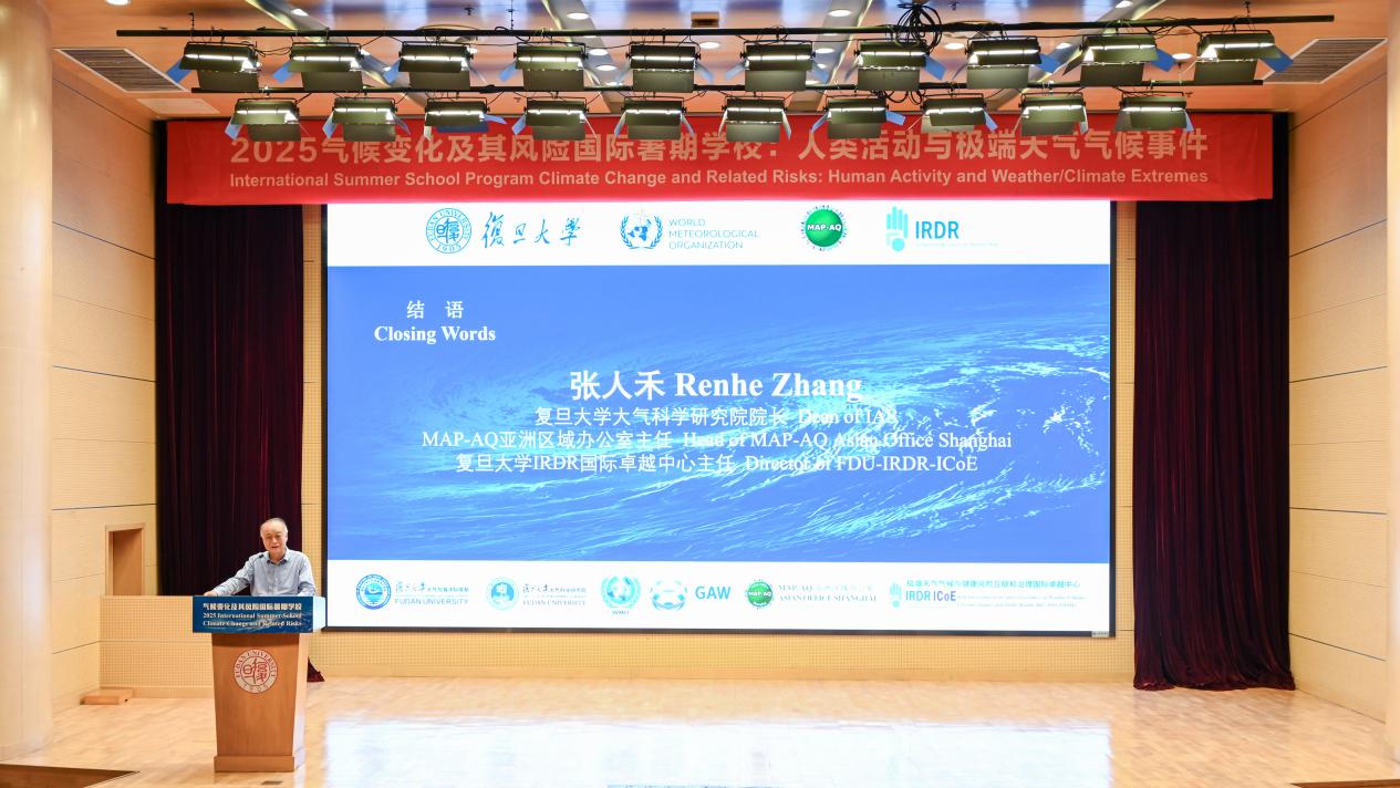 张人禾代表承办单位做总结发言。他充分肯定学员们在短短三周内打破学科壁垒,融合自然科学、社会科学与人文学科,围绕“人类活动与极端天气气候事件”产出了具有前沿性和现实意义的研究成果。他指出,暑期学校聚焦气候变化及其相关风险,已逐步发展为复旦大学面向全球青年打造的重要跨文化、跨学科交流平台。他欣喜地见证同学们在这一过程中拓宽视野、结识伙伴,并希望这段经历能够成为大家未来投身气候治理、服务人类可持续发展的重要起点。他特别感谢所有支持单位、授课专家与组织团队的辛勤付出,并宣布暑期学校将作为长期项目持续开展十年,2026年主题已在筹划中。他诚挚邀请全球青年学者再度相聚复旦,同时鼓励所有学员将此次收获分享给更多同伴,共同扩大这一国际学术品牌的影响力,携手推动气候科学交流与青年人才成长。