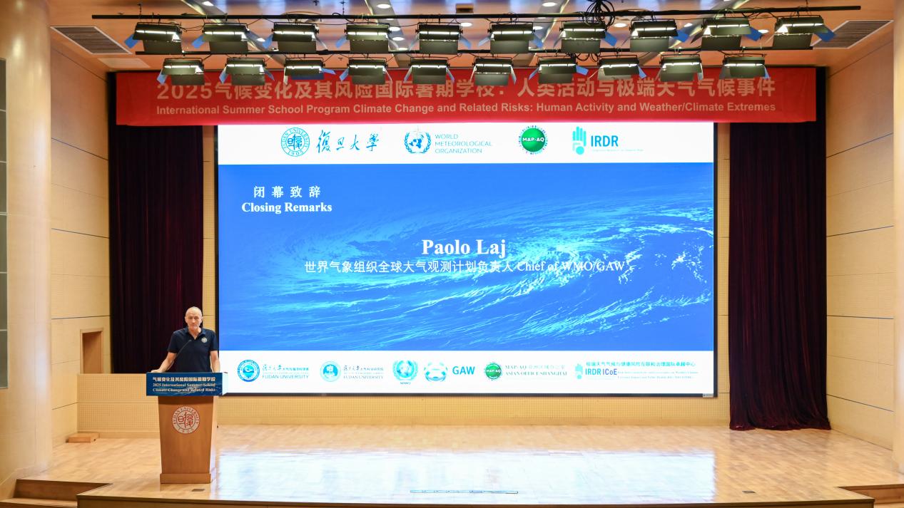 Paolo Laj在致辞中指出,WMO始终将支持青年置于重要位置。暑期学校已成为落实世界气象组织(WMO)与复旦大学合作谅解备忘录(MoU)的旗舰项目,希望未来能够持续扩大国际招生规模,为全球培养青年人才。他表示, WMO将继续资助国际学员来沪参加暑期学校,并派遣专家参与授课。他特别提及学员在Mini-project中提出的“臭氧洞与海洋温度变化”新假设,鼓励大家“即便最终被证伪,也要勇于提出新想法”。同时,他呼吁女性学员更积极争取展示与领导的机会,并强调暑期学校以“三周时间搭建跨国学术共同体”的模式已展现出良好实践效果,值得进一步推广和深化。