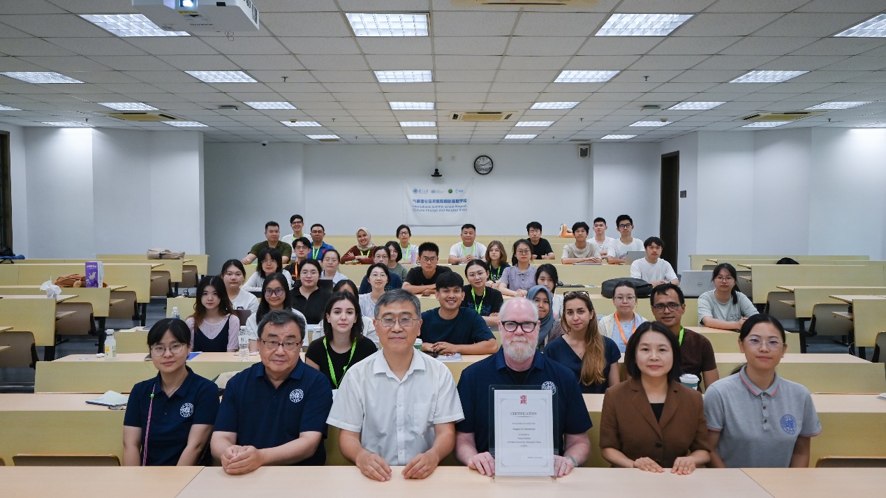 在随后的课程学习与实践环节,5名学员在复旦大学展开了丰富而深入的学习体验。除日常与导师进行技术交流外,学员们还参与了复旦大学2025“气候变化及其风险”国际暑期学校的专题课程,围绕“人类活动与极端天气气候事件”这一议题,系统学习了气候变化理论、前沿知识和协同治理的核心要素,进一步夯实了专业知识体系。与此同时,研修班学员积极参与小型研究项目(Mini-project)设计与研究活动并在课堂上分享了集体研究成果,受到了专家和学员的一致好评。
