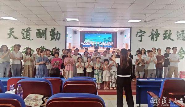 除了AI课程,支教队员还设计了丰富的音体素养表演课。“宁静的夏天/天空中繁星点点/……”《宁夏》的旋律将复旦研支团与宁夏西吉王民中学的支教故事娓娓道来。孩子们跟着节奏拍手哼唱,眼神专注而明亮。音乐教室里,糜羽庭正结合她在复旦大学Echo合唱团的表演经验,和章可晶一起负责音乐教学。