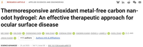 2025年7月25日,复旦大学附属眼耳鼻喉科医院黄锦海、周行涛教授团队与哈佛大学陶伟教授团队携手成功制备一种具有温敏特性的抗氧化碳点(CDs)水凝胶滴眼液——F-CD水凝胶。该水凝胶展现出优异的自由基清除能力,可同步清除羟自由基(OH·)、超氧阴离子(O2−·)和1,1-二苯基-2-苦肼基(·DPPH)等多种自由基。研究成果以“温敏抗氧化碳点水凝胶:眼表疾病治疗领域的新利器(Thermoresponsive antioxidant metal-free carbon nanodot hydrogel: An effective therapeutic approach for ocular surface disease)”为题,发布于期刊《科学进展》(Science Advances)。