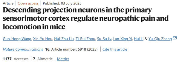 2025年7月3日,复旦大学脑科学研究院、脑功能与脑疾病全国重点实验室张玉秋教授团队在《自然-通讯》(Nature Communications)期刊发表题为《初级感觉运动皮层下行投射神经元调控小鼠神经病理性痛与运动功能》(“Descending projection neurons in the primary sensorimotor cortex regulate neuropathic pain and locomotion in mice”)的研究论文,揭示了初级感觉运动皮层调控神经病理性疼痛和运动控制的特异性神经元亚群及其环路机制。实验表明,激活SM1某些特定的神经元亚群能缓解疼痛,而刺激周围其他神经元反而促进疼痛,为精准镇痛提供了重要线索。