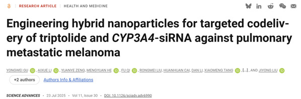 2025年7月23日,复旦大学附属肿瘤医院药剂科刘继勇教授团队在《科学进展》(Science Advances)发表最新研究成果:其研发的工程化仿生纳米递药系统TP-siRC@tHyNPs,成功实现对肺转移性黑色素瘤的精准靶向治疗,不仅显著提升药物疗效,还大幅降低毒副作用,为这一恶性肿瘤的精准治疗开辟新路径。