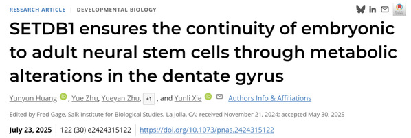 2025年7月23日,复旦大学脑科学研究院、脑功能与脑疾病全国重点实验室解云礼课题组在《美国国家科学院院刊》(PNAS)上发表题为“SETDB1通过代谢调控确保齿状回中胚胎至成年神经干细胞的连续性(SETDB1 ensures the continuity of embryonic to adult neural stem cells through metabolic alterations in the dentate gyrus)”的研究论文,该研究深入解析了表观遗传调控因子——组蛋白甲基转移酶SETDB1调控海马齿状回区域星形胶质细胞发生的关键分子机制。