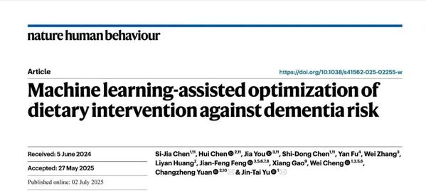 2025年7月2日,复旦大学附属华山医院郁金泰教授团队与浙江大学医学院公共卫生学院和附属第二医院袁长征研究员团队在期刊《自然-人类行为》(Nature Human Behaviour)发表突破性研究成果。该研究创新性地运用机器学习方法,对4个国际纵向队列(1个发现队列,3个外部验证队列)22万名参与者(近3000新发痴呆/痴呆相关死亡病例)的膳食数据进行深度分析,首次提出基于人工智能构建的包括绿色蔬菜、浆果、柑橘类水果、禽肉、蛋类、马铃薯、橄榄油等在内的8类核心食物构成的最佳痴呆预防“MODERN膳食方案”,即机器学习辅助下的痴呆饮食干预方法(Machine learning-assisted Optimizing Dietary Intervention against Dementia Risk),为痴呆预防提供了新的潜在有效方案。