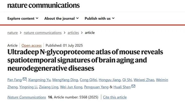 2025年7月1日,复旦大学生物医学研究院申华莉团队与苏州大学生命科学学院分子酶学研究所合作在《自然-通讯》(Nature Communications)在线发表题为“Ultradeep N-glycoproteome atlas of mouse reveals spatiotemporal signatures of brain aging and neurodegenerative diseases”的研究成果,首次构建了迄今规模最大的小鼠多器官N-糖蛋白组数据库。