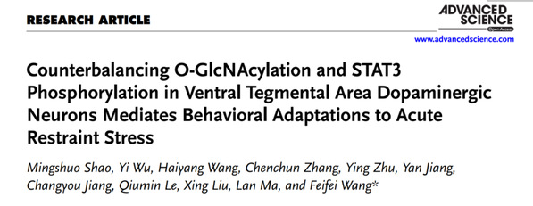 2025年7月21日,复旦大学基础医学院、脑科学研究院、脑功能与脑疾病全国重点实验室王菲菲、马兰教授课题组揭示了VTA多巴胺能神经元中O-GlcNAc糖基化及STAT3 Ser727磷酸化相互制衡,调控急性应激引起的神经活动和行为变化。该研究以“VTA多巴胺能神经元O-GlcNAc糖基化及STAT3 Ser727磷酸化相互制衡,调控急性应激引起的行为改变(Counterbalancing O-GlcNAcylation and STAT3 Phosphorylation in Ventral Tegmental Area Dopaminergic Neurons Mediates Behavioral Adaptations to Acute Restraint Stress)”为题,在线发表在《先进科学》(Advanced Science)上。