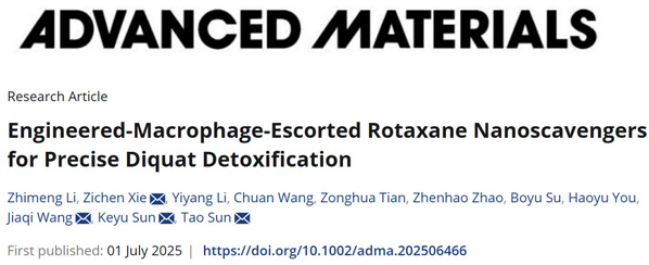 2025年7月1日,复旦大学药学院药剂学系孙涛团队在杂志《先进材料》(Advanced Materials)上发表题为“Engineered-Macrophage-Escorted Rotaxane Nanoscavengers for Precise Diquat Detoxification” 的研究论文 。研究提出了一种基于生物启发的精准解毒策略,开发了一种由工程化巨噬细胞护送的轮烷纳米清道夫系统,实现了对敌草快的精准识别、捕获与解毒,同时减轻器官氧化损伤并提高中毒小鼠的生存率。