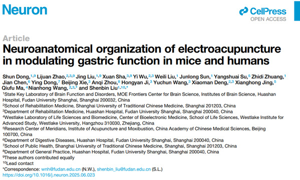 2025年7月25日,复旦大学脑科学研究院柳申滨团队与复旦大学附属华山医院王念宏团队合作在《神经元》(Neuron)杂志上发表题为 《小鼠和人类中电针调节胃功能的神经解剖学机制》(“Neuroanatomical organization of electroacupuncture in modulating gastric function in mice and humans”)的研究论文,系统阐明了高强度深部组织电针刺激调控胃功能的效应规律及其神经解剖学基础,并成功将这一研究成果转化为功能性消化不良的临床治疗方案。