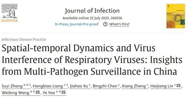 2025年7月22日,复旦大学公共卫生学院王伟炳教授、姚烨副教授团队与台州市疾病预防控制中心合作,利用台州市流感样病例(ILI)的多病原监测数据,探讨了对不同呼吸道病毒在大流行后的时空动态和病毒之间的相互干扰现象。研究结果以“Spatial-temporal Dynamics and Virus Interference of Respiratory Viruses: Insights from Multi-Pathogen Surveillance in China”为题发表于《感染杂志》(Journal of Infection)上。
