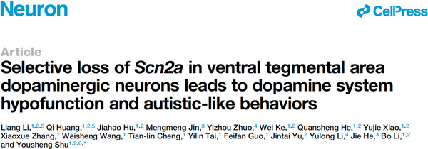 2025年7月10日,复旦大学脑科学转化研究院舒友生教授团队在神经科学期刊《神经元》(Neuron)上发表了题为“Selective loss of Scn2a in ventral tegmental area dopaminergic neurons leads to dopamine system hypofunction and autistic-like behaviors”的研究论文。该研究另辟蹊径,将目光转向与社交奖赏密切相关的腹侧被盖区(Ventral tegmental area, VTA)。在以往研究中,团队发现该脑区多巴胺神经元的轴突始段大量表达NaV1.2,因而推测Scn2a功能缺失可能通过影响多巴胺神经元的功能导致孤独症样行为。