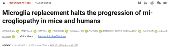 2025年7月11日,复旦大学脑科学转化研究院彭勃、饶艳霞团队与上海市第六人民医院曹立团队携手在《科学》(Science)上发表突破性研究成果:通过替换中枢神经系统中的致病性小胶质胞,成功阻断了CSF1R相关脑白质病(ALSP)在动物模型中的病程进展。该研究还首次揭示,由于携带CSF1R致病基因突变,传统骨髓细胞移植(tBMT)在ALSP特定病理背景下,机制上等效于该团队开发的小胶质细胞替换技术Mr BMT,能够实现小胶质细胞高效替换和神经功能改善。在此基础上,研究团队进一步开展了临床治疗研究,并在为期两年的随访中证实了该方法能够有效阻止ALSP患者病情恶化。