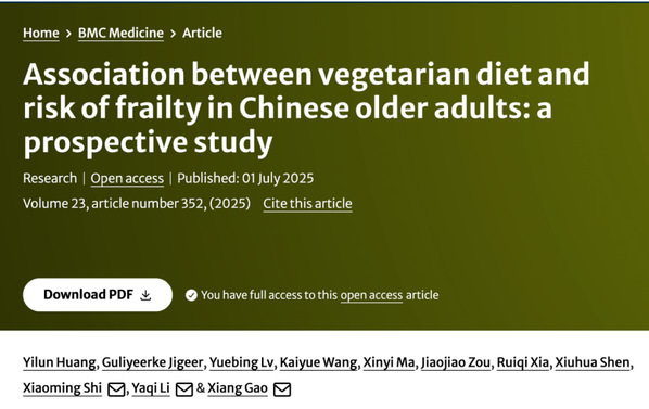 2025年7月1日,复旦大学营养研究院(筹)、复旦大学公共卫生学院高翔教授、李亚琦副研究员团队联合国家疾病预防控制中心,在《BMC医学》(BMC Medicine)上发表了一篇题为“Association between vegetarian diet and risk of frailty in Chinese older adults: a prospective study”的论文,研究发现,相较于坚持非素食的人群,坚持素食者的衰弱风险显著增高19%。值得注意的是,虽然从素食转变为非素食者的风险也较高,约14%,但相比坚持素食者风险已略有下降。此外,从非素食转变为素食者的衰弱风险同样较高,约16%。