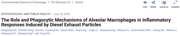 2025年7月16日,复旦大学公共卫生学院阚海东教授、徐燕意副教授团队联合美国马里兰大学应哲康教授团队,揭示了肺泡巨噬细胞在柴油机颗粒物(Diesel exhaust particles,DEP)引发肺部炎症中的关键影响,并首次揭示了巨噬细胞清道夫受体1(macrophage scavenger receptor 1, Msr1)在颗粒物吞噬作用中的核心功能。研究成果以“The Role and Phagocytic Mechanisms of Alveolar Macrophages in Inflammatory Responses Induced by Diesel Exhaust Particles”为题,发表于《环境科学与技术》(Environmental Science & Technology)。