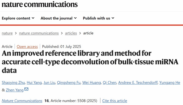 2025年7月1日,复旦大学智能医学研究院杨桢、何云刚团队联合皖南医学院弋矶山医院杨辉博士在《自然-通讯》(Nature Communications)杂志发表了题为“An improved reference library and method for accurate cell-type deconvolution of bulk-tissue miRNA data”的研究论文。该工作创新性地提出利用miRNA表达图谱作为复杂组织细胞异质性解析的新方法,建立了基于miRNA表达图谱的复杂组织细胞异质性解析模型,探究利用miRNA图谱获取复杂组织的细胞组成、以及对肿瘤等生物样本中免疫浸润水平进行定量的研究策略。