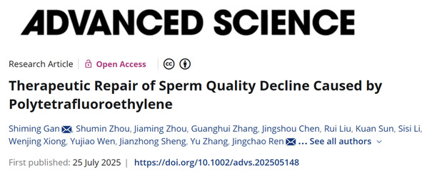 2025年7月25日,复旦大学生殖与发育研究院黄荷凤院士团队在杂志《先进科学》(Advanced Science)上发表了题为“Therapeutic Repair of Sperm Quality Decline Caused by Polytetrafluoroethylene”的原创性研究成果。该研究发现微塑料PTFE 在人群泌尿生殖系统检出率达 46.62%,且随年龄增加在男性生殖系统有蓄积效应,与精子质量下降密切相关。