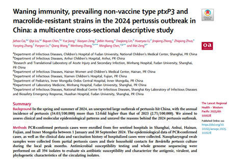 2025年7月4日,复旦大学附属儿科医院曾玫教授团队与复旦大学附属闵行医院陈明亮教授团队等共同完成的研究成果以“Waning immunity, prevailing non-vaccine type ptxP3 and macrolide-resistant strains in the 2024 pertussis outbreak in China: a multicentre cross-sectional descriptive study”为题,在线发表于《柳叶刀-区域健康(西太平洋)》(The Lancet Regional Health - Western Pacific)。该多中心研究系统揭示了中国2024年百日咳大规模暴发的流行病学特征及驱动机制,为我国百日咳防控提供了关键科学证据。